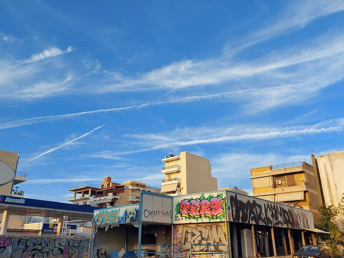 Στην ανωτέρω φωτογραφία απεικονίζεται η χημική σούπα της 10ης Οκτωβρίου 2024 από τον συνήθη αεροψεκασμό που πραγματοποιούν συχνά-πυκνά δεκάδες αεροπλάνα, τα οποία διασχίζουν μπακλαβαδωτά τον ουρανό της Αττικής πάνω από τα κεφάλια των υπεραπασχολημένων Αθηναίων.