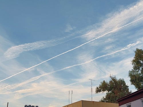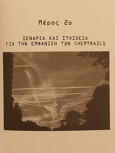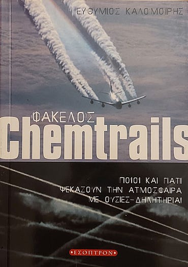 Όπως δεν γνωρίζαμε τι περιέχουν τα φαρμακευτικά σκευάσματα της Νέας Τάξης Πραγμάτων , που με λύσσα προπαγάνδισαν οι επίδοξοι εξολοθρευτές μας ιδίως τη διετία 2020-2022, έτσι δεν γνωρίζουμε τι περιέχουν και οι παχιές λευκές γραμμές , οι οποίες δεν διαλύονται μέσα σε λίγα δευτερόλεπτα ή έστω μέσα. σε λίγα λεπτά από τη στιγμή που διαχέονται στον αέρα (τότε θα επρόκειτο για τα contrails ), αλλά παραμένουν στην ατμόσφαιρα μετασχηματιζόμενα σε αιωρούμενα νέφη που απλώνονται ακανόνιστα , με αποτέλεσμα να κρύβεται ο ήλιος (γι' αυτό ονομάζονται chemtrails ) ¹ .